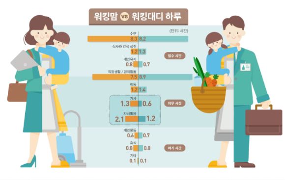 워킹맘의 하루 휴식 시간은 1.4시간, 워킹대디는 1.5시간으로 집계됐다 워킹대디는 직장생활과 경제활동 시간(8.9시간)이, 워킹맘은 가사와 자녀돌봄 시간(3.4시간)이 상대적으로 많았다.