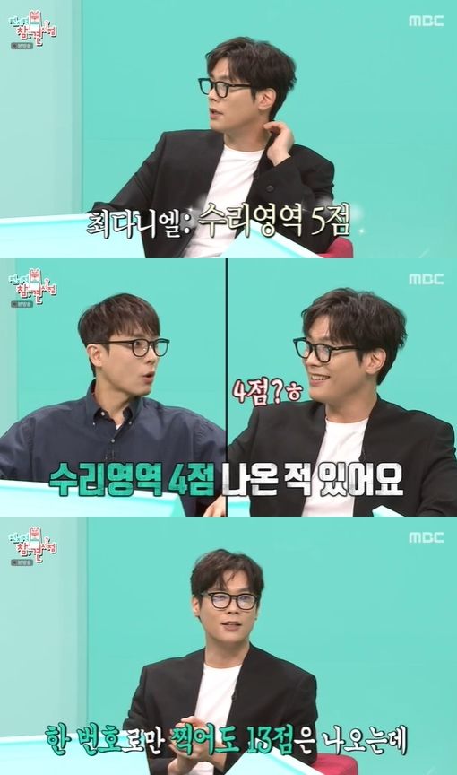 이에 최다니엘은 "저는 다 풀었다. 다 풀고 시간이 남아서 좀 잤다"며 "한 번호로만 찍어도 13점은 나올텐데, 풀어서 5점이 나와서 충격이었다"고 털어놨다.