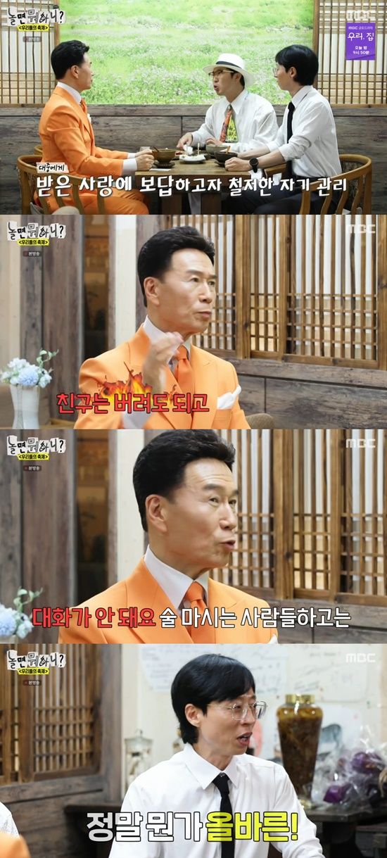 유재석 역시 동감하며 "저도 그렇다"고 물개박수를 쳤다. 강진은 "술 마시는 사람과는 대화가 안된다. 오염되는 느낌이다. 맨정신인 사람하고만 대화한다"고 했다.