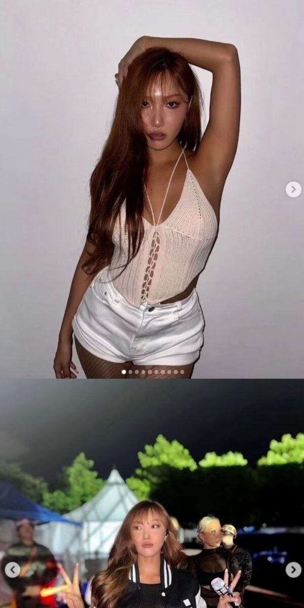 특히 화사는 단독 사진에서 니트 슬리브리스에 핫팬츠를 입고 탄탄한 구릿빛 피부를 드러내며 자신만의 매력을 한껏 발산했다. 또 다른 사진에서는 점퍼 속 블랙 시스루 의상으로 섹시한 분위기를 자아내 팬들의 시선을 사로잡았다.