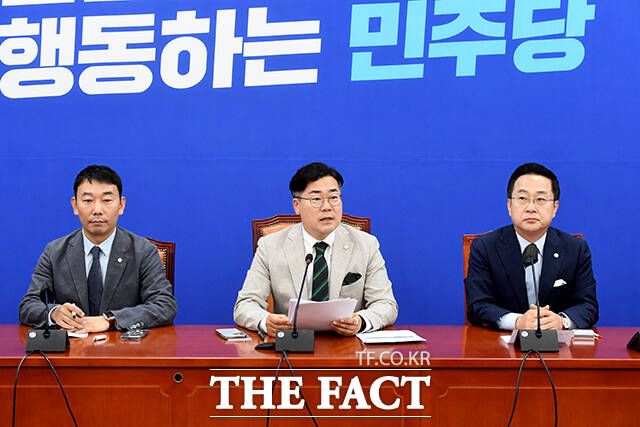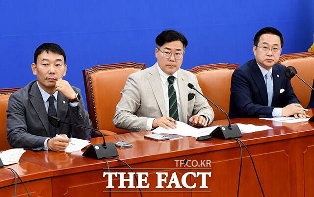 취재진 질문 듣는 김용민 원내정책수석부대표와 박찬대 원내대표, 박성준 원내수석부대표(왼쪽부터).