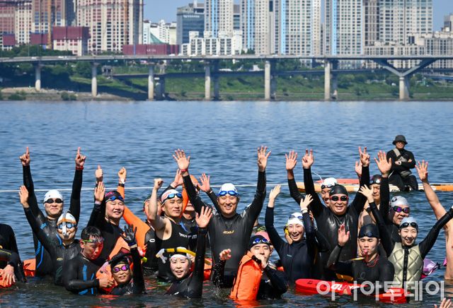 오세훈 서울시장이 2일 서울 송파구 잠실수중보에서 출발하는 '제1회 쉬엄쉬엄 한강 3종 축제' 상급자 코스 수영 1km(잠실수중보 남단~북단)에 참가해 중간 쉼터인 모래톱 위에서 참가자들과 함께 손을 흔들고 있다. /정재훈 기자