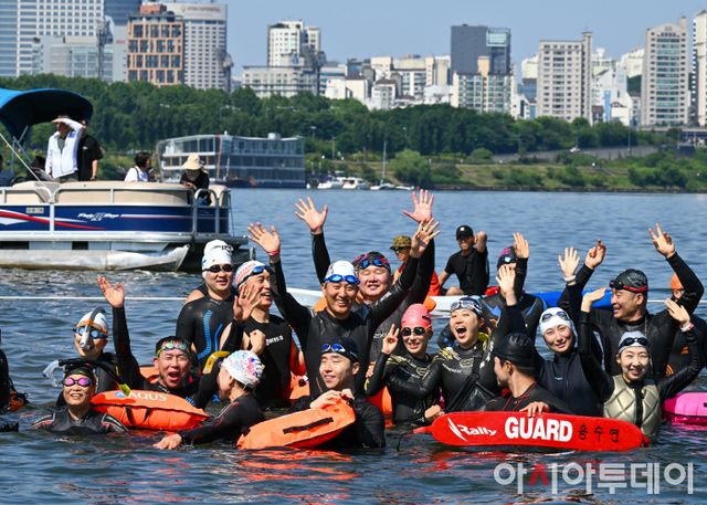 오세훈 서울시장이 2일 서울 송파구 잠실수중보에서 출발하는 '제1회 쉬엄쉬엄 한강 3종 축제' 상급자 코스 수영 1km(잠실수중보 남단~북단)에 참가해 중간 쉼터인 모래톱 위에서 참가자들과 함께 손을 흔들고 있다. /정재훈 기자