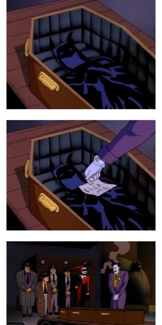 배트맨이 진짜로 죽었다고 생각하자 훔친 물건들도 모두 제자리에 돌려놓으라고 하고