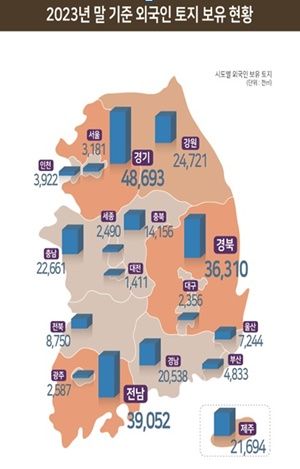 2일 국토교통부에 따르면 지난해 말 기준 외국인이 보유한 도내 토지 면적은 2169만4000㎡로 전년 대비 0.6% 감소했다. 외국인 보유 토지의 공시지가는 5773억원으로 0.8% 증가했다.