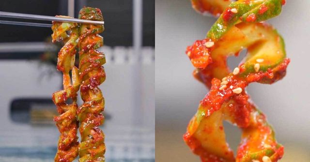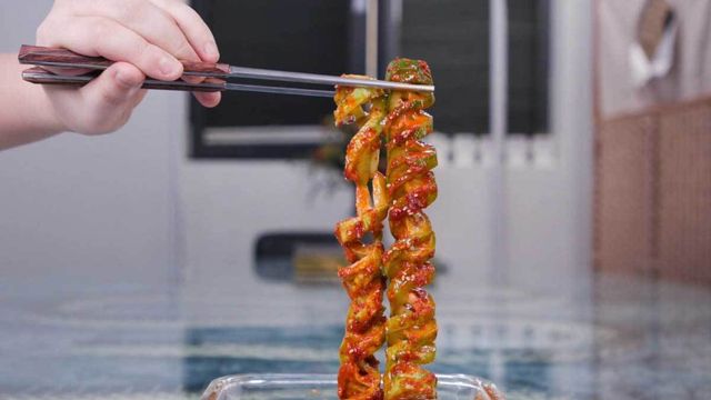먼저 오이를 씻어 옆에 젓가락을 대고, 어슷썰기 하듯 사선으로 칼집을 내준다. 그다음 오이를 뒤집어서 이번에는 90도 수직으로 칼집을 내어주면, 꽈배기 모양으로 쭉 늘어나는 오이가 완성된다. 이어 오이에 굵은소금을 뿌려 10분 이상 절인 후 물기를 빼주면 재료 준비가 끝난다.