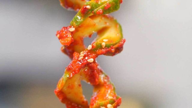 '꽈배기 오이소박이' 만드는 법은 양조식초 4T, 설탕 2.5T, 고춧가루 3~4T, 참기름 1T, 다진 마늘 1/2T를 넣고 잘 섞어 양념장을 만든다. 이어 양념장을 오이 사이사이에 잘 펴 발라주고 깨를 솔솔 뿌려준다.
