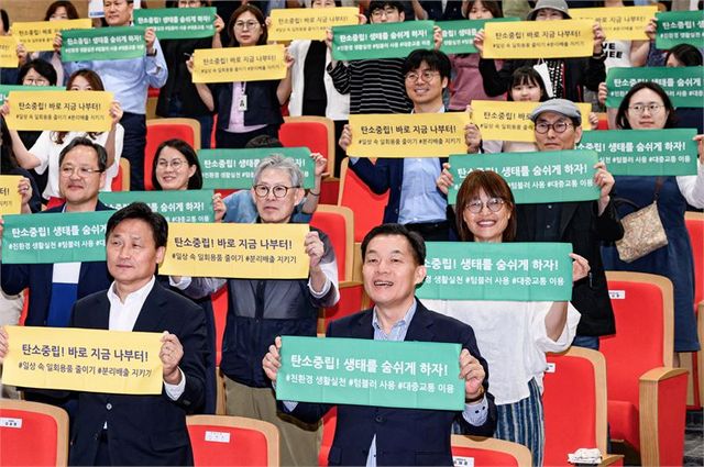 이재준 시장과 참석자들이 함께 ‘탄소중립! 생태를 숨 쉬게 하자!’, ‘탄소중립! 바로 지금 나부터!’라는 구호를 외치는 것으로 기념식은 마무리됐다.