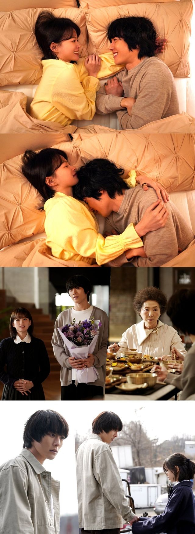 그런 가운데 공개된 사진에는 복귀주의 극과 극 반전 모드가 담겨있다. 먼저 복씨네 집으로 돌아온 도다해와 한 침대에 마주 누운 복귀주의 세상 어느 때보다 행복한 미소가 눈길을 끈다. 도다해의 따뜻한 팔베개, 달콤한 눈맞춤이 로맨틱한 분위기를 자아낸다. 그러나 복만흠의 불안한 눈빛은 예지몽이 가리키는 복귀주의 미래를 더욱 궁금하게 한다.