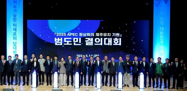 지난달 14일 제주관광대학교 컨벤션홀에서 열린 2025 APEC 정상회의 제주 유치 범도민 결의대회. 제주도 제공