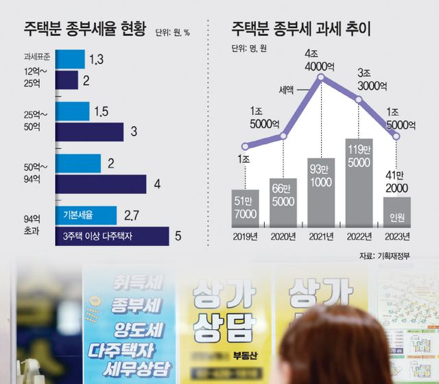 지난해 주택분 종부세 납부 대상은 41만명, 종부세액은 1조5000억원 수준이다. 전년보다 납부 인원과 세액이 모두 크게 줄었다. 윤석열 정부 출범 직후부터 종부세율을 낮추고 중과 대상을 줄이며 종부세 부담은 점차 완화되는 추세다.