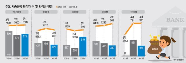 은행별로 보면 지난해 KB국민은행의 1인당 기본퇴직금은 전년 대비 555만원 줄어든 7498만원이었다. 지난해 희망퇴직으로 713명이 짐을 쌌는데, 이들에게 지급된 희망퇴직금 규모는 3억8100만원이다. 희망퇴직금과 기본퇴직금을 더하면 4억5598만원으로, 오히려 전년 대비 500만원 더 많은 퇴직금을 받고 나간 것이다.