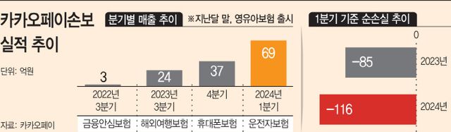 2일 보험업계에 따르면 카카오페이손보의 올해 1분기 매출은 69억원을 기록했다. 2022년 3분기만해도 3억원에 불과했던 매출 규모는 작년 3분기를 기점으로 폭발적으로 성장했다. 2022년10월 카카오페이손보 출범 1년여 만에 이뤄진 성과다.