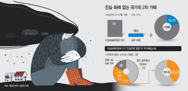이런 상황에서 진화위 권고와 법원의 판단을 뒤집으려는 시도도 종종 발생해 피해자들을 두 번 울리고 있다. 아시아투데이가 2기 진화위가 출범한 2020년 12월 10일부터 지난달까지 진화위의 '진실규명 결정'을 받고 국가배상소송을 제기한 사건들을 전수조사한 결과, 총 80건의 1심 사건 중 77건이 원고 일부승소 혹은 승소 판결을 받았다. 하지만 국가가 이 중 40%에 달하는 31건에 불복한 것으로 나타났다.