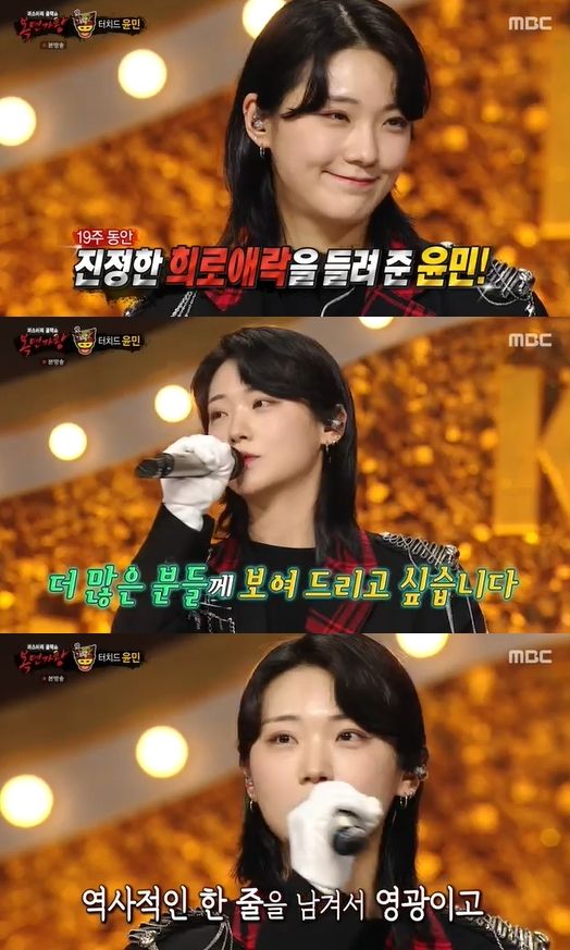 윤민은 "기억에 남는 건 '데스노트' 무대였다. 많은 분들이 사랑해 주셔서 기억에 남는다. 승리를 거듭할수록 왕관의 무게에 눈물을 흘리기도 했지만, 판정단 분들의 조언을 들으며 내가 마음을 다르게 가져야겠다는 생각을 했다. 누굴 이기려는 생각보다는 나를 더 보여주겠다는 마음을 가졌다"고 덧붙였다.