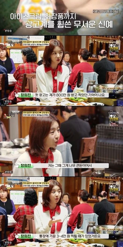 장희진은 "광고로 데뷔해서 광고를 많이 찍었다. 첫 광고는 800만원 받고 찍었다. 그때 너무 큰 돈이었다. 잡지모델 한 달 열심히 찍어도 통장에 3, 4만원 찍힐 때가 있었다