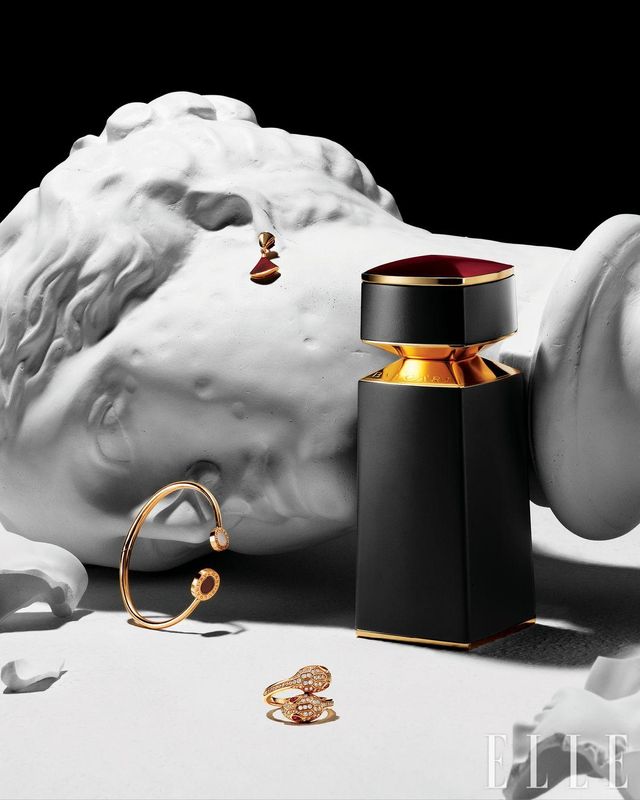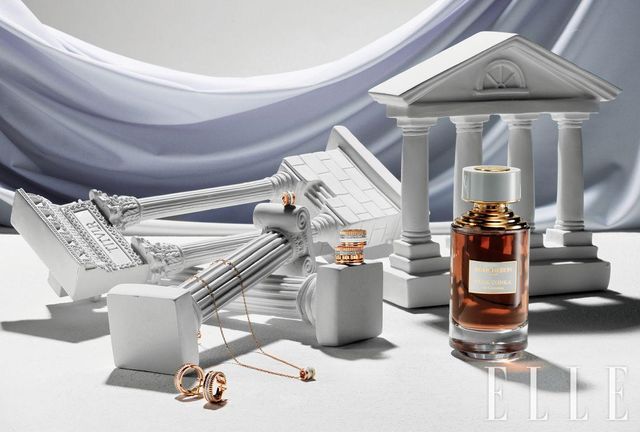 향수와 함께 놓인 주얼리는 로즈골드에 커넬리언 장식을 더한 디바스 드림 이어링, 4백42만원, 서로 다른 크기의 원형 디스크에 담긴 은은한 마더 오브 펄과 선명한 커넬리언이 포인트인 불가리 불가리 브레이슬릿, 7백50만원, 신화 속에 나오는 뱀의 유혹적인 눈빛을 감각적인 디자인으로 풀어낸 세르펜티 세두토리 링, 1천5백만원, 모두