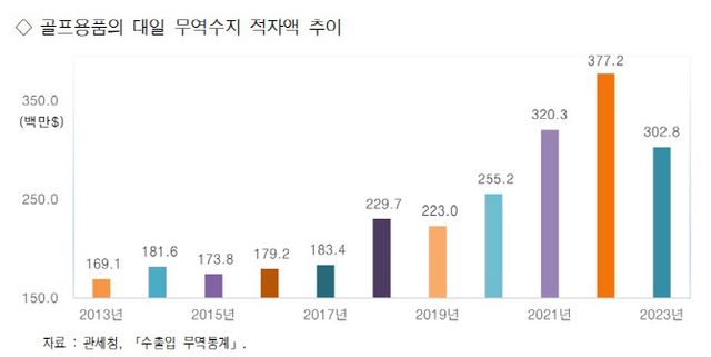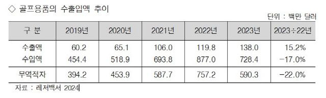 골프용품의 무역수지 적자액은 2023년 5억 9030만달러(약 8175억원)로 전년보다 22.0% 축소됐다. 수입규모가 줄어들어 적자액도 감소했다. 그중 골프클럽(골프채)의 무역수지 적자액은 전년보다 23.6% 감소한 4억 6740만달러(약 6473억원)다. 전체 골프용품 무역수지 적자액의 79.2%를 차지했다.