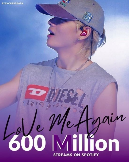 최근 방탄소년단(BTS) 뷔의 솔로곡 '러브 미 어게인'이 스포티파이에서 6억 스트리밍을 돌파했다.