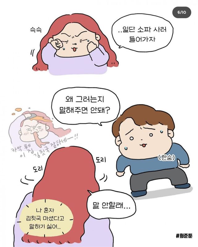 삐졌는데 혼자 김칫물 마시거나 너무 쪼잔한 걸로 삐진거 아니까말하기 싫은거라고 댓글로 공감파티 하더라