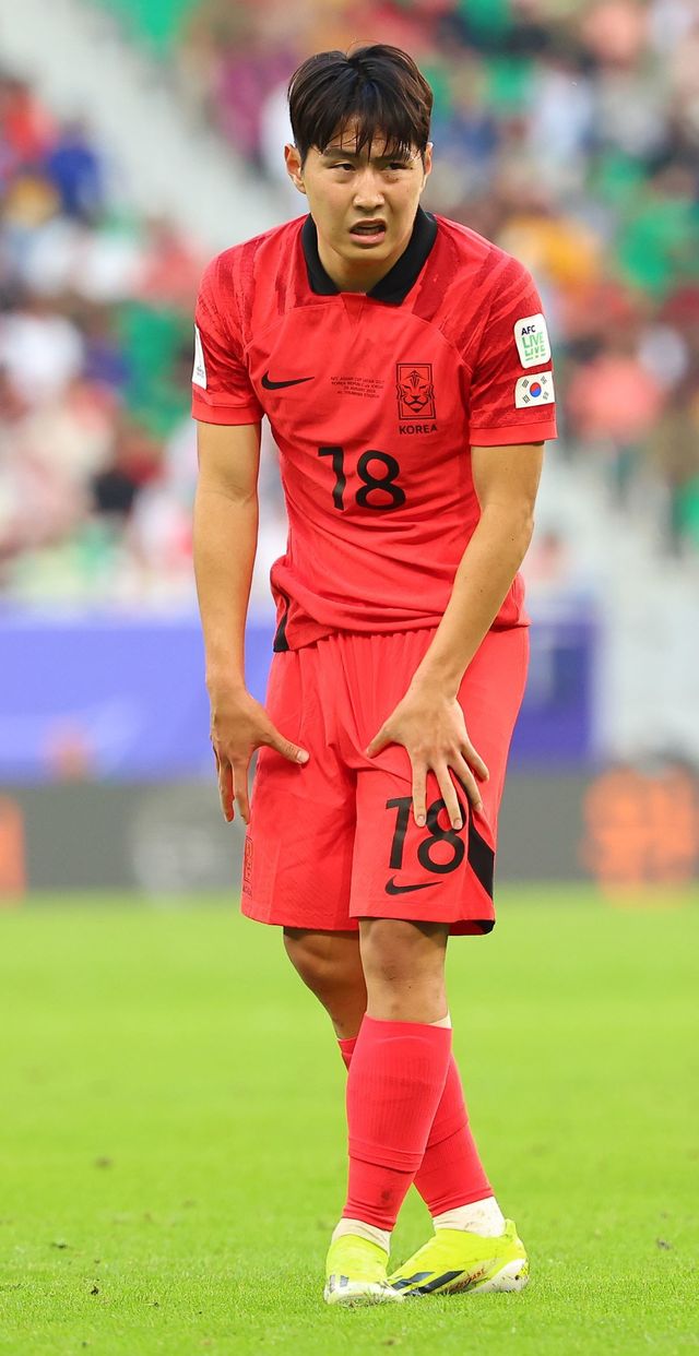 2024년 1월 20일(현지 시각) 카타르 도하 앗수마마 스타디움에서 열린 2023 아시아축구연맹(AFC) 카타르 아시안컵 조별리그 E조 2차전 요르단과 한국의 경기에서 이강인이 경기 중 통증을 호소하고 있다. / 연합뉴스