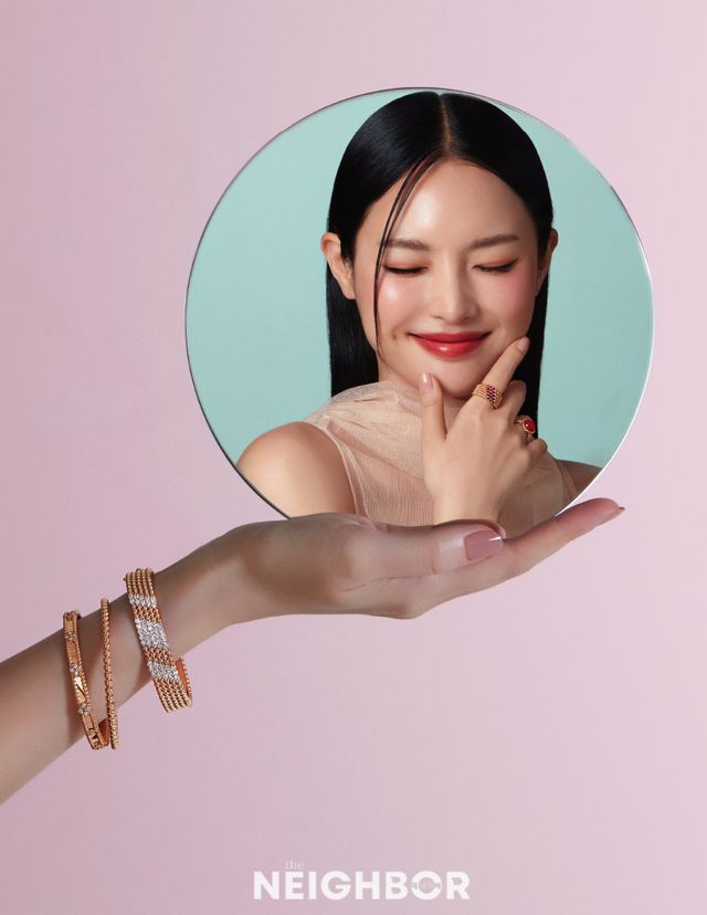 행운을 상징하는 메종의 클로버 모티프를 다이아몬드로 표현한 18K 로즈 골드 소재 뻬를리 스위트 클로버 브레이슬릿 2300만원대, 한 줄로 이어진 볼드한 골드 비즈가 세련된 분위기를 전하는 18K 로즈 골드 소재 뻬를리 브레이슬릿 600만원대, 5줄로 이어진 18K 로즈 골드 비즈 사이에 다이아몬드를 사선으로 세팅해 광채를 더한 뻬를리 다이아몬드 브레이슬릿 가격 미정, 18K 로즈 골드 비즈 사이에 15개의 루비를 사선으로 장식한 뻬를리 컬러 링, 5개 라인 1800만원대, 카닐리언과 18K 로즈 골드 비즈가 만나 유쾌한 감각을 구현한 뻬를리 컬러 링 300만원대.