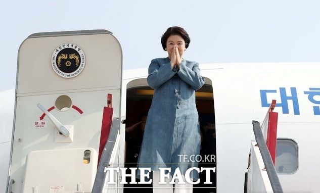 국민의힘 당권주자인 윤상현 의원이 3일 오후 김정숙 인도 타지마할 방문과 관련해 특검법을 발의할 예정이다. 인도 방문 일정을 마친 김정숙 여사가 2018년 11월 7일 우타르프라데시주 아그라 군공항에서 공군 2호기에 탑승하며 인사를 하고 있다. /뉴시스