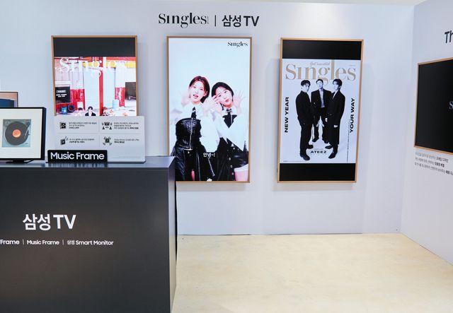 스튜디오 가장 안쪽으로 들어가니 액자 속에서 <싱글즈> 역대 커버 스타들의 영상이 하나 둘씩 지나가고 있었다. 비디오 아트 갤러리처럼 연출된 액자와 모니터는 바로 ‘삼성 The Frame’과 ‘스마트모니터 M8’. 베젤이 자석으로 되어 있어 탈부착이 용이하고, 디자인 또한 자유자재로 바꿀 수 있다. 갤러리 같은 분위기를 완성하는 건 이뿐만이 아니었다. 부스 제일 앞에 놓여 있던 작은 액자 또한 맞춤형 디자인을 지원하는 무선 연결 스피커 ‘뮤직 프레임 LS60D’였다. 삼성 공식 홈페이지 내 ‘커스텀 스튜디오’에 방문하면, 스피커 전면에 원하는 이미지를 넣을 수 있는 아트 패널을 구매할 수 있다. 싱글즈>