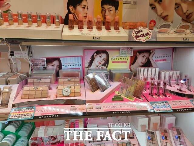 CJ올리브영이 국내 외국인 관광객이 많은 지역을 중심으로 대형 매장을 잇달아 내면서 해외 진출 강점을 키우는 가운데 지난달 25일 일본 효고현 고베시 한 화장품 매장에 '웨이크메이크' 제품이 진열돼 있다. /일본=우지수 기자