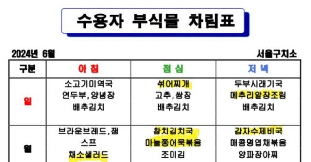3일 서울구치소 6월 '수용자 부식물 차림표'가 온라인 커뮤니티와 사회관계망서비스(SNS)에 확산하면서 누리꾼들의 이목을 끌었다.