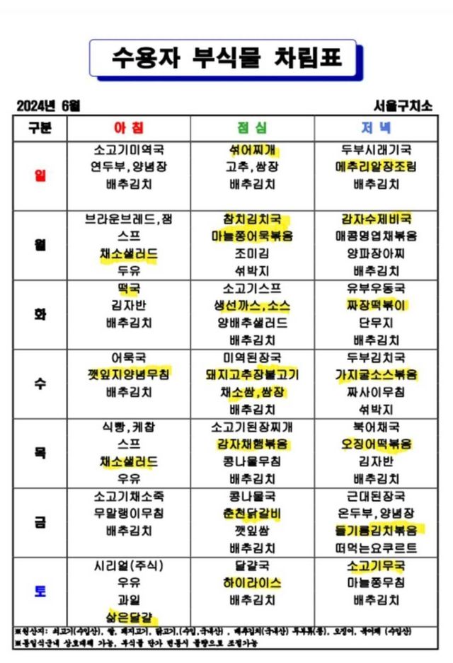 2024년 6월 서울구치소 수용자 부식물 차림표 / 온라인커뮤니티=뉴스1