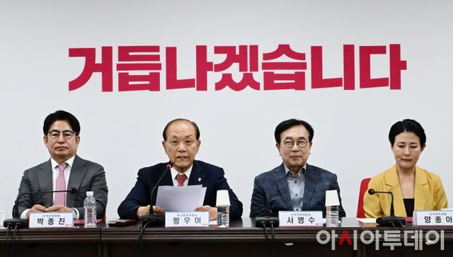 아시아투데이 이병화 기자 = 황우여 국민의힘 비상대책위원장이 3일 서울 여의도 국민의힘 중앙당사에서 열린 제4차 전당대회 선거관리위원회 임명장 수여식 및 1차회의에서 발언을 하고 있다. 오른쪽은 서병수 선거관리위원장.