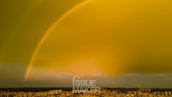 이날 저녁 비가 내린 후 하이난성 충하이시 상공에는 두 줄기의 무지개가 떴다. 노을에 비친 도시와 무지개가 서로 어우러져 더욱 장관을 이뤘다. 2024.6.3
