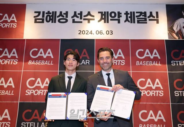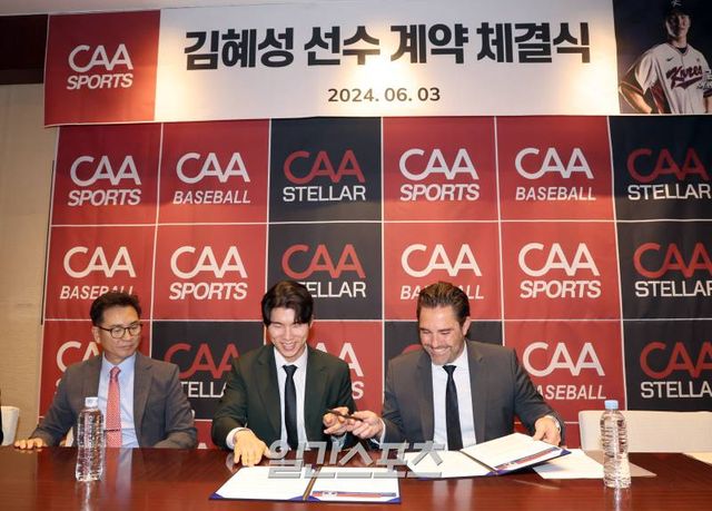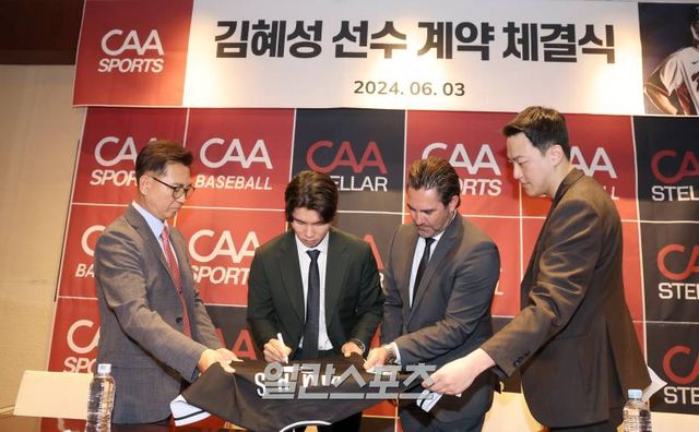김혜성은 3일 서울 용산구 그랜드하얏트서울 비즈니스센터에서 CAA 스포츠와 계약 체결식을 가졌다. 이 자리엔 마이크 니키스 CAA 스포츠 에이전트, 장기영 CAA 스텔라 코리아 대표, 우중건 부대표가 참석했다. 김혜성과 CAA 스포츠는 사인 계약서를 주고받은 등 행사를 진행한 뒤 취재진과 인터뷰를 가졌다.