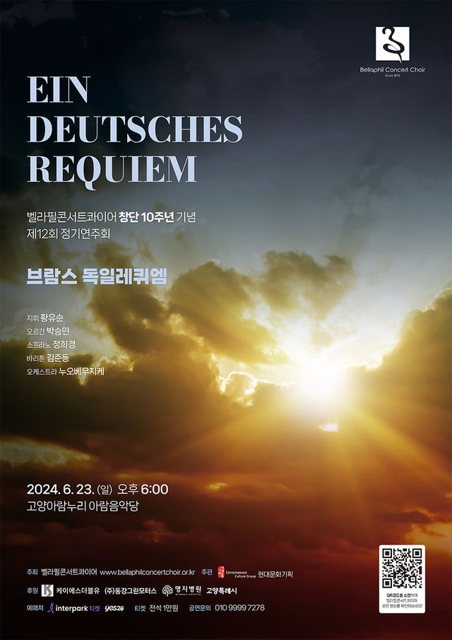 벨라필콘서트콰이어(이하 벨라필)의 열두 번째 정기연주회가 오는 6월 23일(일) 오후 6시 고양아람누리 아람음악당에서 열린다. 벨라필콘서트콰이어가 주최하고 현대문화기획이 주관하는 이번 무대의 프로그램은 브람스의 ‘독일 레퀴엠’으로 진행한다.