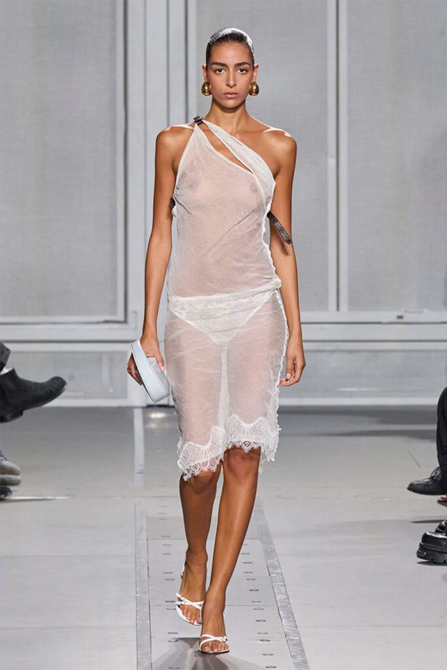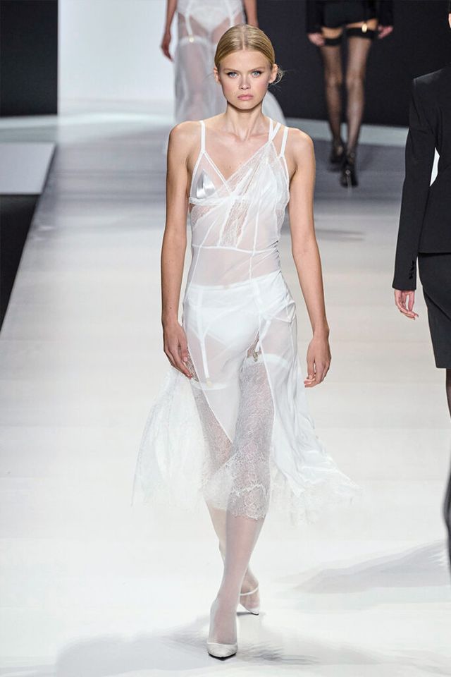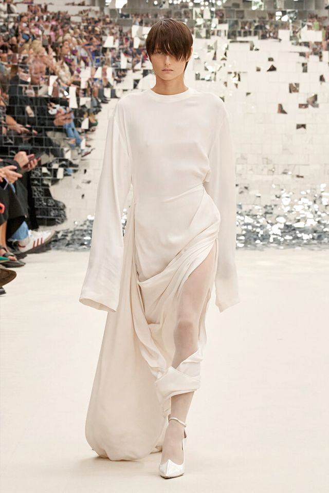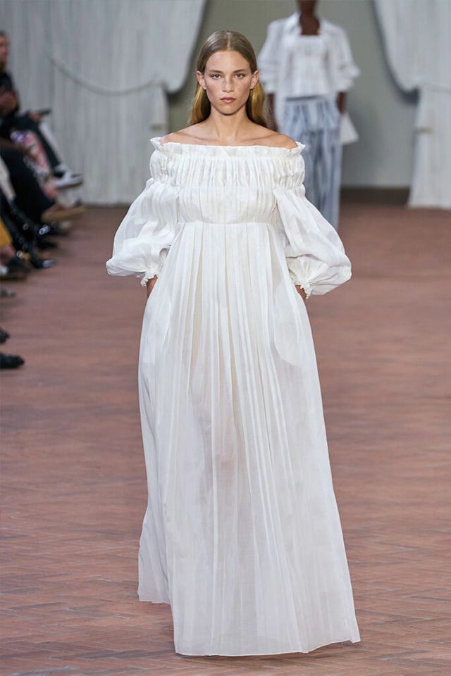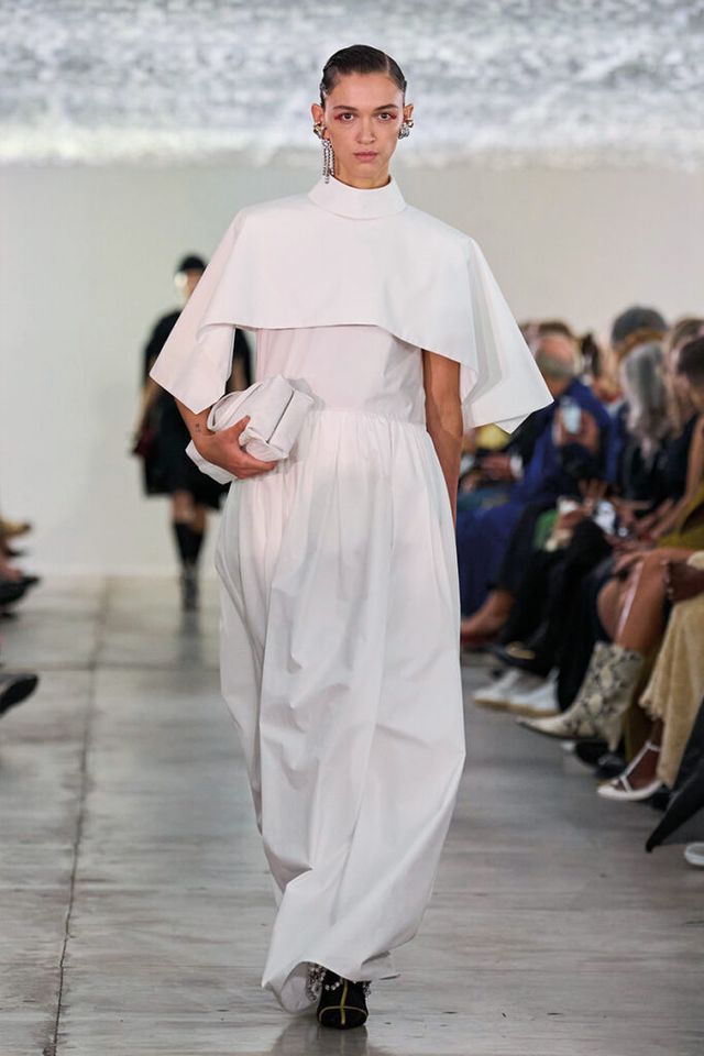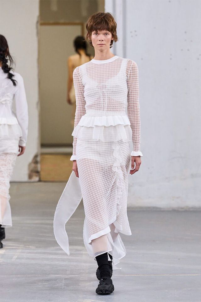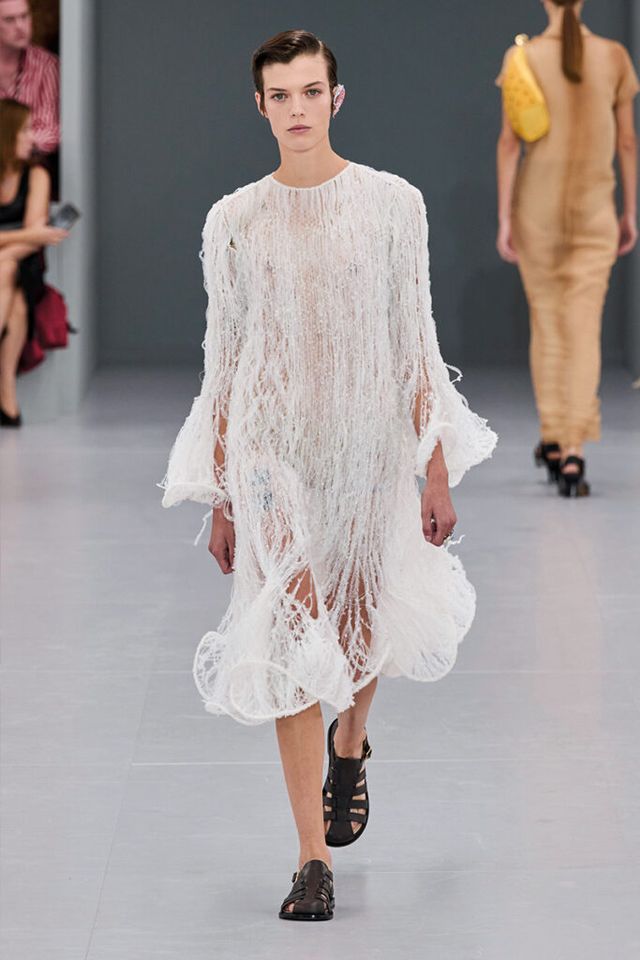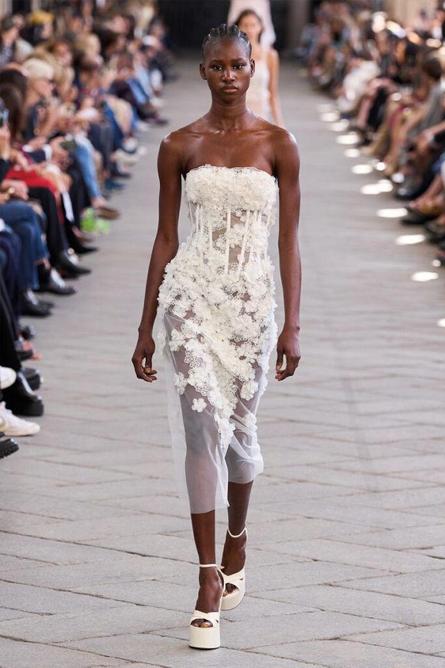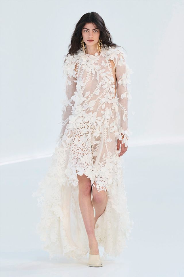 불투명한 천으로 빈틈없이 몸을 감싼 이들과 반대로 속이 훤하게 비쳐 보디라인이 아찔하게 드러나는 룩 또한 줄을 이었다. 짐머만을 위시해 에르마 노 설비노, 세실리에 반센은 3D 플라워 장식과 풍성한 셔링으로 컬러를 비운 자리를 입체감으로 채운 룩을 런웨이에 올렸다. 장식의 볼륨감이 부담스럽다면 레이스 천을 사용하는 것도 좋은 대안이다. 코페르니와 돌체앤가바나는 간결한 기본 원피스 밑단에 하늘하늘한 레이스를 가미해 우아하고 고혹적인 분위기를 더했다. 더 나아가 프라다와 로에베는 손대면 바스러질 것 같은 연약한 소재 아래 살갗과 보디라인이 은근히 드러나는 관능적인 실루엣을 연출했다. 정제된 간결함이 돋보이는 드레스부터 화려한 디테일을 더한 고혹적인 드레스까지. 순백의 아름다움이 불러온 이 움직임에 동승하는 방법은 어렵지 않다. 그저 올 화이트를 선택하는 담대한 애티튜드면 충분하다.