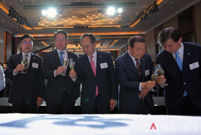 아시아투데이 송의주 기자 = 박찬대 더불어민주당 원내대표, 최태원 대한상의 회장, 추경호 국민의힘 원내대표(왼쪽부터)가 3일 오후 서울 여의도 콘래드 서울 그랜드볼룸에서 대한상공회의소가 개최한 제22대 국회의원 환영 리셉션에 참석해 건배하고 있다.