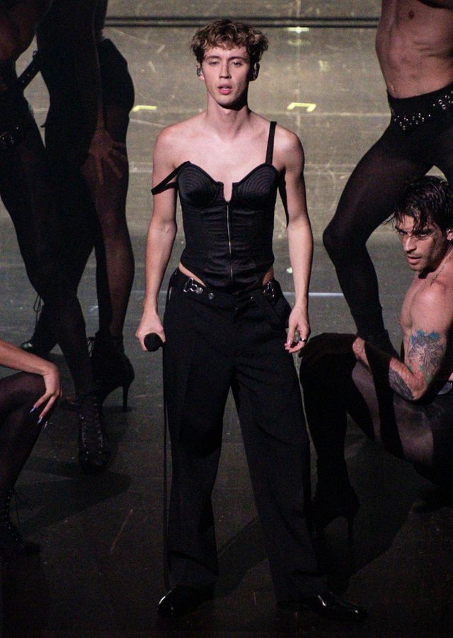 장 폴 고티에의 아이코닉한 콘 브라를 재해석한 룩도 등장했습니다. 마돈나의 콘 브라가 전복적인 여성상을 그려냈다면, 트로이는 강인하면서 동시에 유약한 블랙 코르셋 톱으로 이를 소화해냈죠.