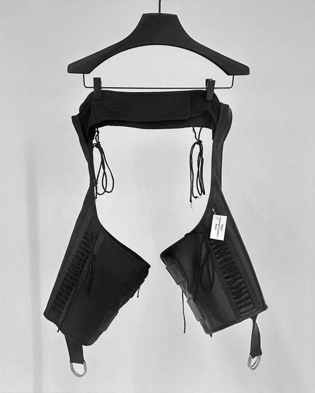 언뜻 보기에 평범해 보이는 아이템에도 비밀이 숨어있습니다. 슬리브리스 위에 그가 레이어드한 건 다름 아닌 하니스였는데요. 팬츠 위로는 블랙 코르셋을 마치 벨트처럼 매치했죠. 거친 매력이 엿보이는 이 모든 아이템은 피터 도가 트로이를 위해 손수 제작한 커스텀