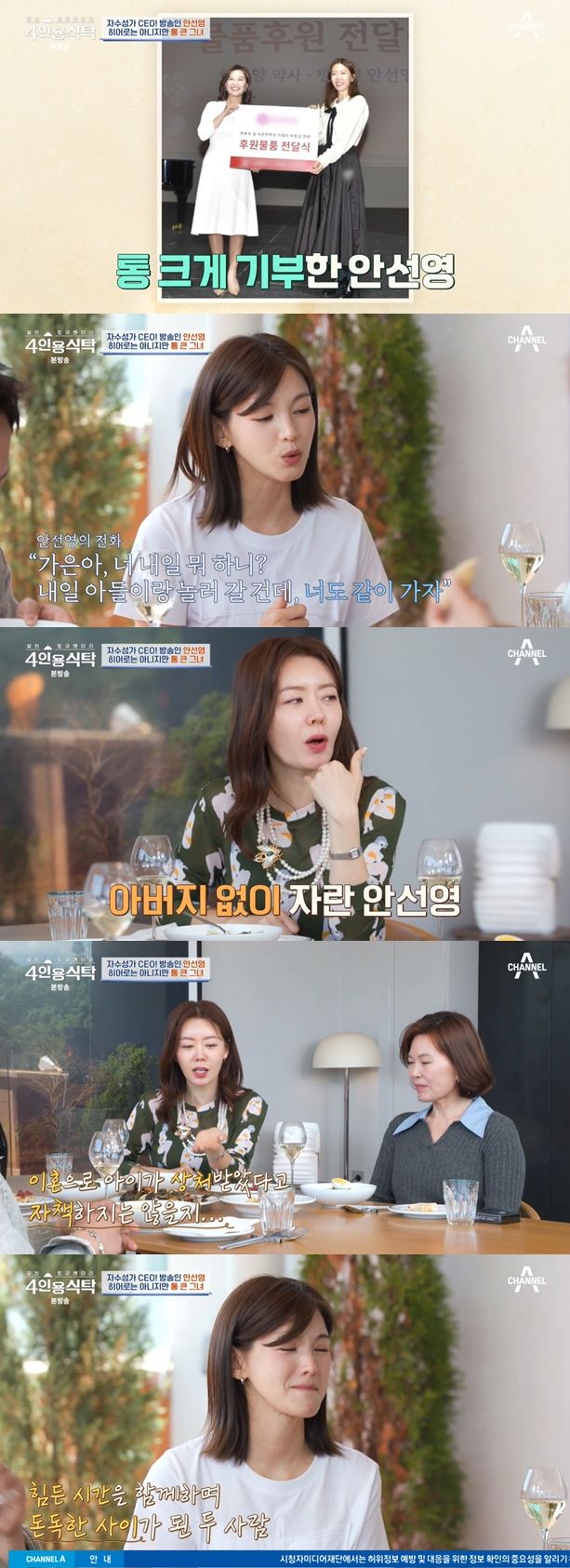 3일 방송된 채널A '4인용식탁'에는 CEO 겸 방송인 안선영이 출연했다. 이날 게스트로는 변호사 양소영, 방송인 정가은과 배우 송진우가 초대됐다.