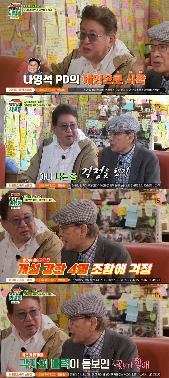 '꽃할배'로 인연을 맺은 네사람은 어떻게 모이게 됐는지 토론에 나섰다. 김용건은 "나영석 PD의 제안으로 시작했다. 각자 다 연락이 따로 왔다"며 모이게 된 계기를 설명했다.