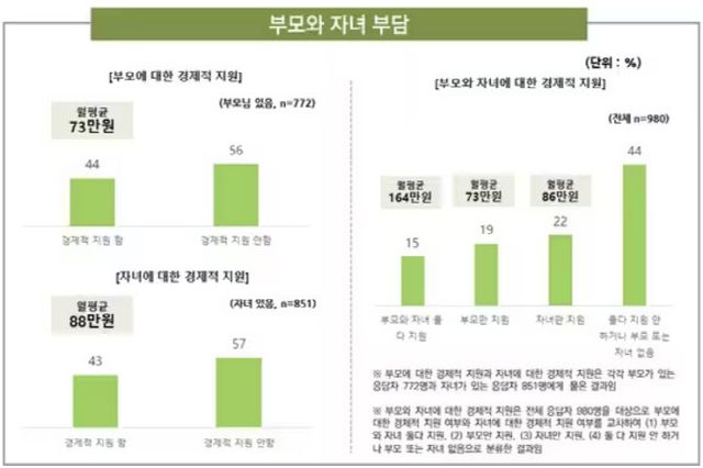 응답자의 15%는 부모와 자녀 양쪽 모두를 부양하는 ‘이중부양’을 하며 월평균 164만 원을 지출했다.