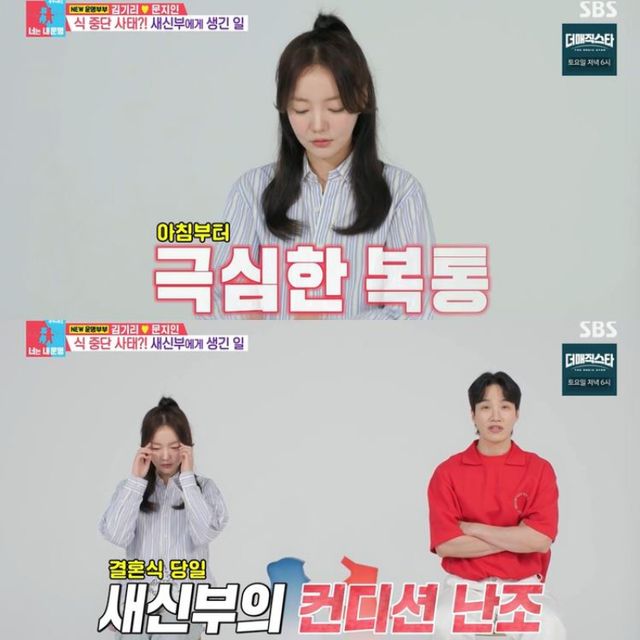김기리는 “결혼식 당일에 지인 씨가 못 일어났다. 배를 부여잡고 소리를 지르더라”면서 “식을 할 수 있을까 걱정했다”고 말했다. 문지인은 “119에 실려가면 어떡하지? 할 정도로 심각했다”면서 “이때까지 살면서 긴장해 본 적이 크게 없었는데 결혼식 당일에 폭발했다”고 이야기했다.