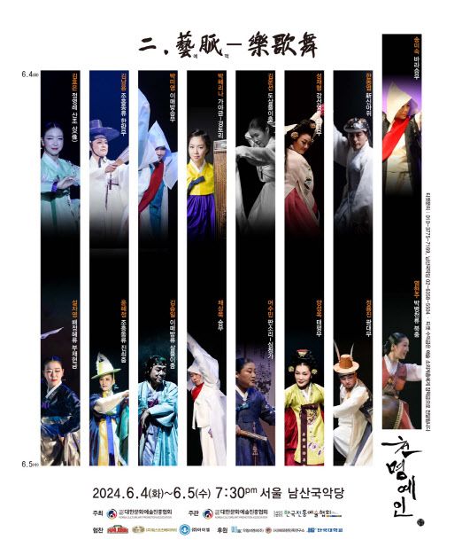 사단법인 대한문화예술진흥협회는 4~5일 오후 서울 중구 서울남산국악당에서 제2회 예맥-악가무 축제 ‘천명예인(天命藝人)’이 열린다고 3일 밝혔다. 하늘의 뜻에 따라 전통문화를 갈고 닦은 천명예인들이 춤, 노래, 연주를 한 무대에서 선보인다.