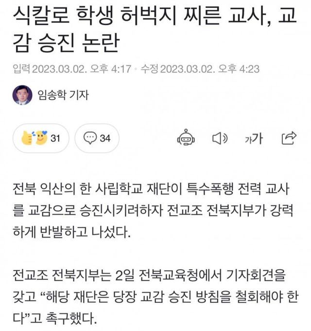 전교조 전북지부에 따르면 A교사는 2014년 10월27일 당시 자율학습 시간에 바둑을 둔 학생들을 훈계하는 과정에서 허벅지에 길이 4㎝ 상처를 입힌 것으로 확인됐다. 상처를 낸 도구는 과일을 깎기 위해 들고 있던 조리용 칼이었다.