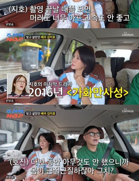 김호진은 "너 마지막 작품 언제 했지?"라며 질문했고, 김지호는 "'가화만사성'이었다. 2016년에 했다"라며 깜짝 놀랐다. 김호진은 "8년이란 시간 동안"이라며 공백기가 길었다는 사실을 체감했고, 김지호는 "내가 늙었나 봐. 새삼 더 느끼는 것 같아. 아이 핑계 대고"라며 씁쓸해했다.