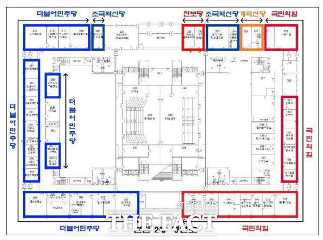 조국혁신당은 본관 사무공간이 원내 의석 비율에 맞춰봐도 부족한 데다 유일하게 분리 배정되어 공간 활용도가 낮다고 지적한다. 사진은 본관 2층 평면도. /혁신당 제공