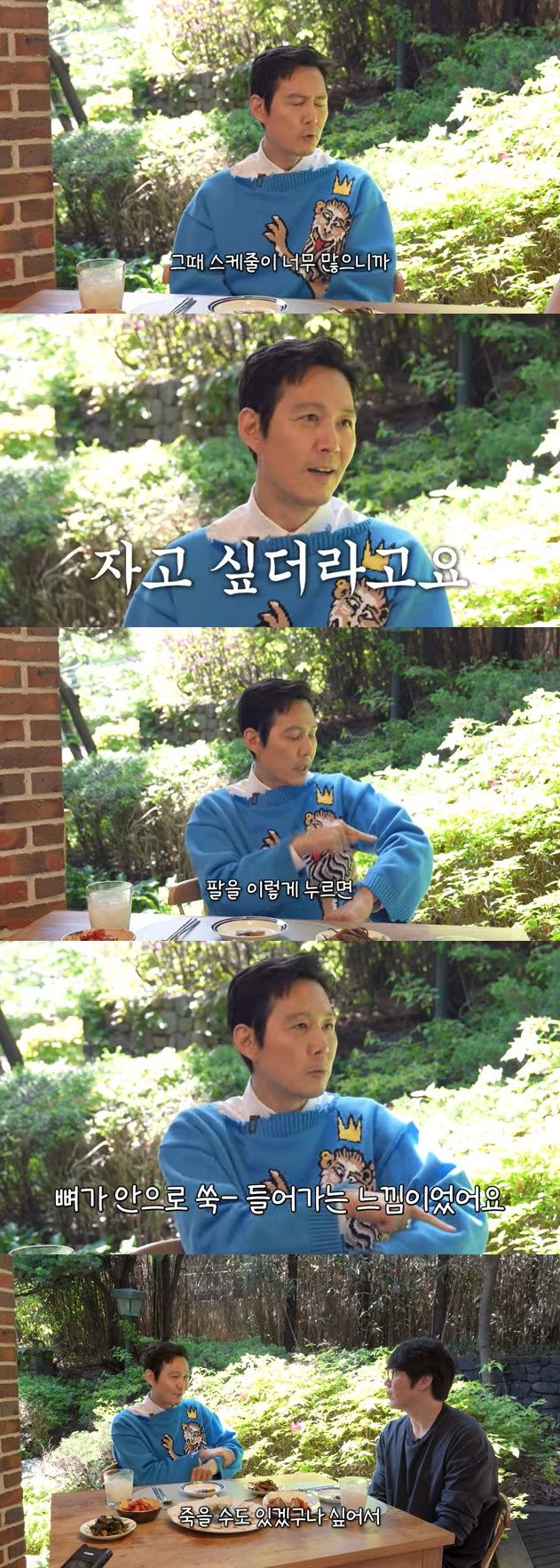 이정재는 "낮 시간에 '모래시계'를 찍고 밤 촬영으로 '젊은 남자'를 찍고 다음 날 아침에 '느낌'을 찍고 이걸 1년을 하다 보니까 잠을 못 잤다. 그때 스물 두 살이었는데도 불구하고 팔을 누르면 뼈가 안으로 쑥 들어가는 느낌이었다"며 힘들었던 당시를 회상했다.