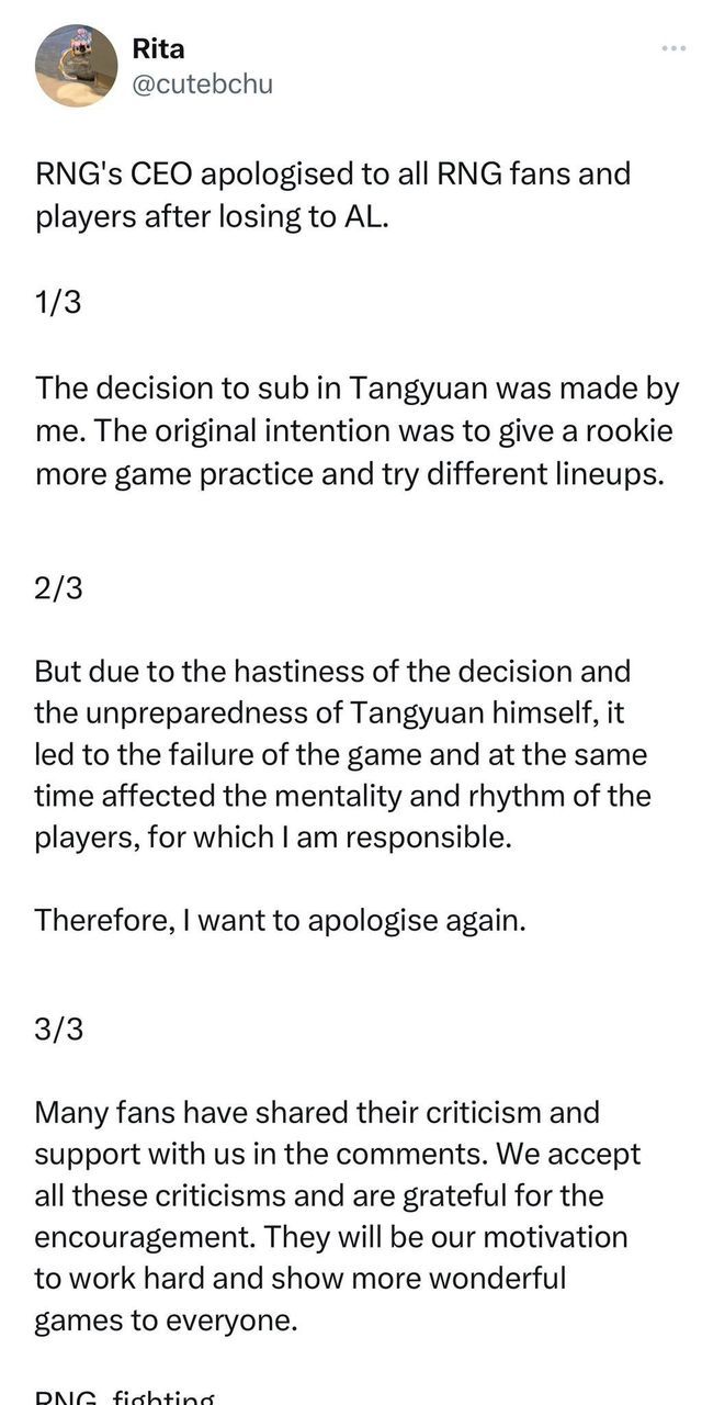RNG 대표가 RNG vs AL 경기에서 유망주 키우고 싶어서 2세트 미드 교체 지시를 내렸고