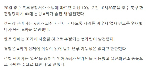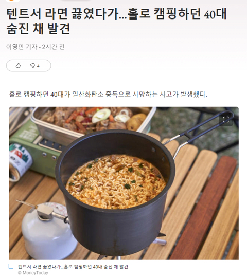 연소장비를 사용해야한다면 아무리 추워도 환기를 동시에 병행해야 하고, 일산화탄소경보기를 필수장비로 구비해야함. 이는 비단 텐트뿐만 아니라 가정내 보일러실에도 의무적으로 사용해야하는 장비임.